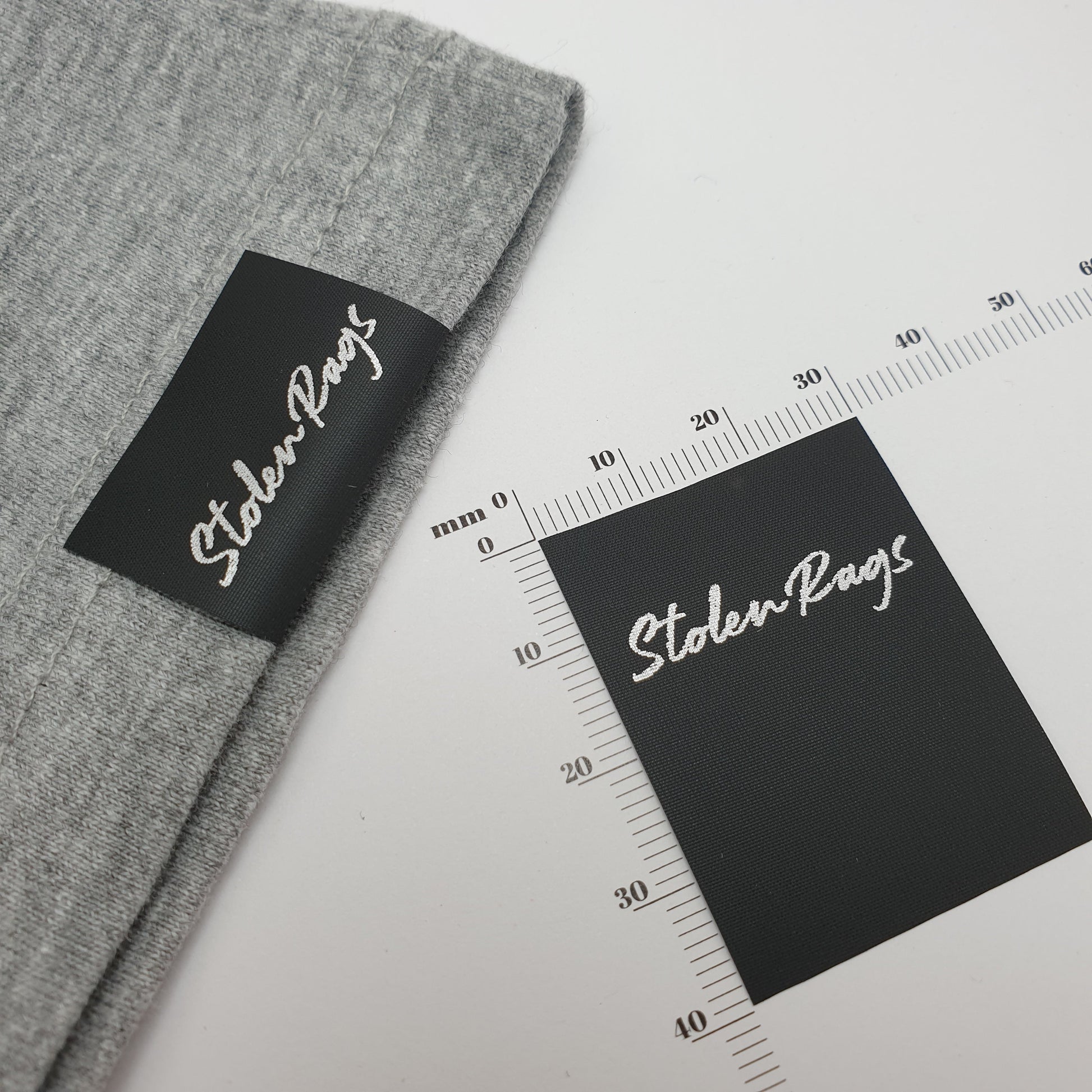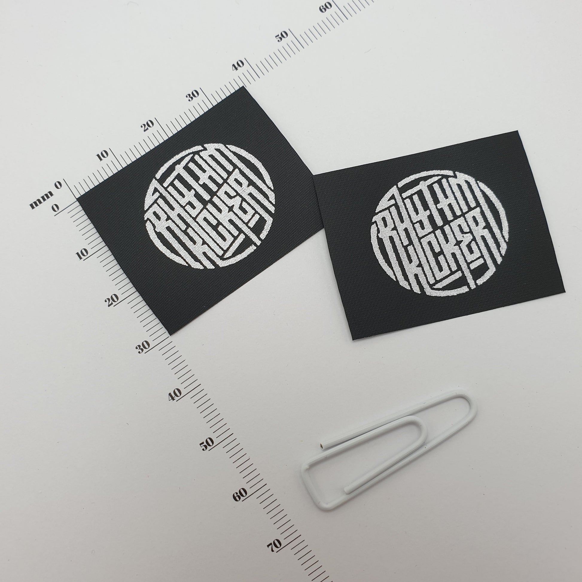 Our standard printing is one of the most commonly used print throughout the clothing industry for care labels. This is a single colour print, where one colour is printed for all printing. There is no shading or gradients, just one solid colour - similar to the result of an ink stamp. Your artwork must have solid black in the areas to be printed and white or transparent where the material is left unprinted. For a silver on black label, you will effectively have your artwork inversed: black on white.